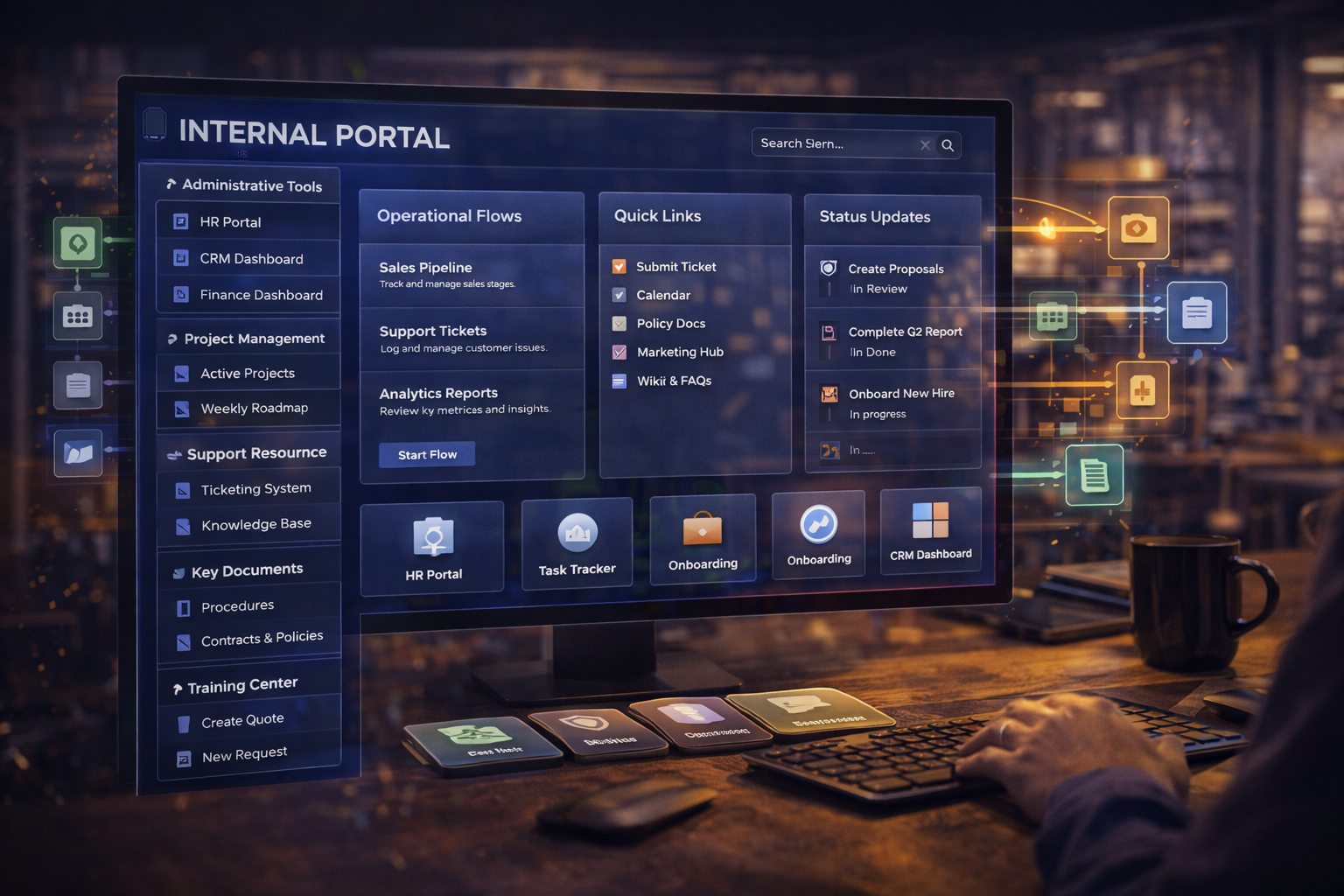 Dashboards, portais e ferramentas que aceleram a operação.