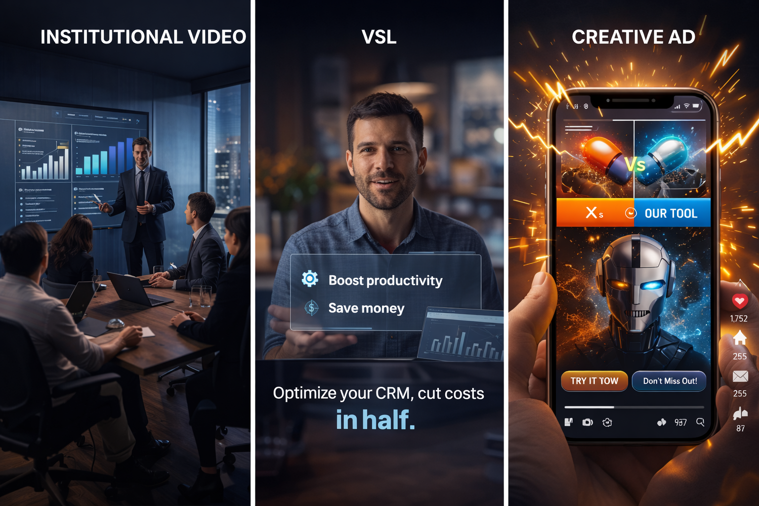 Criativos, vídeos e produção com escala e consistência.